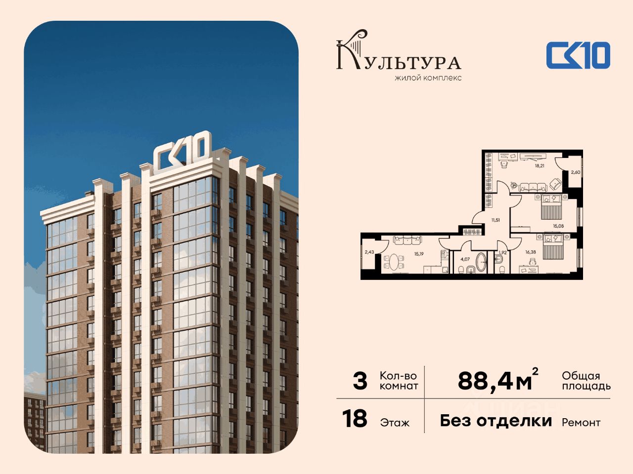 Продаётся 3-комнатная квартира в строящемся доме (поз. 4), срок сдачи: III-кв. 2028, общей площадью 88.36 кв.м., на 18 этаже. Новый жилой комплекс ''Культура'' от группы компаний ''СК10'' расположен по адресу: г. Ростов-на-Дону, по ул. Текучёва.